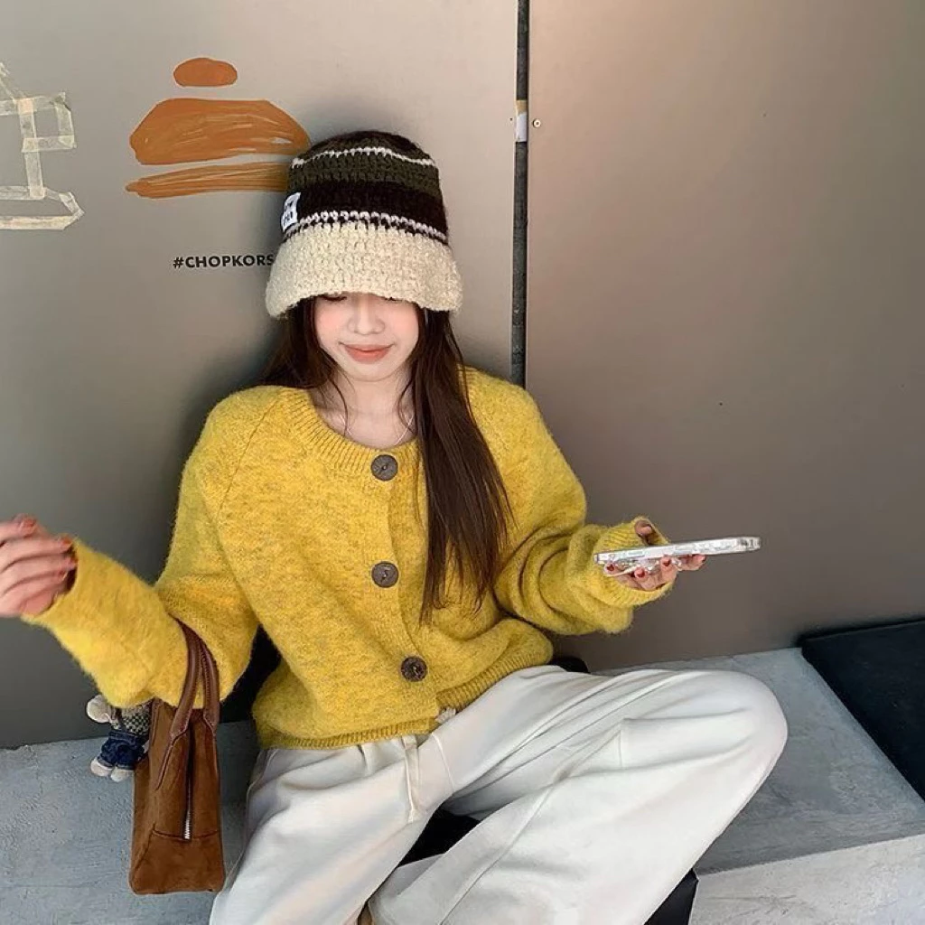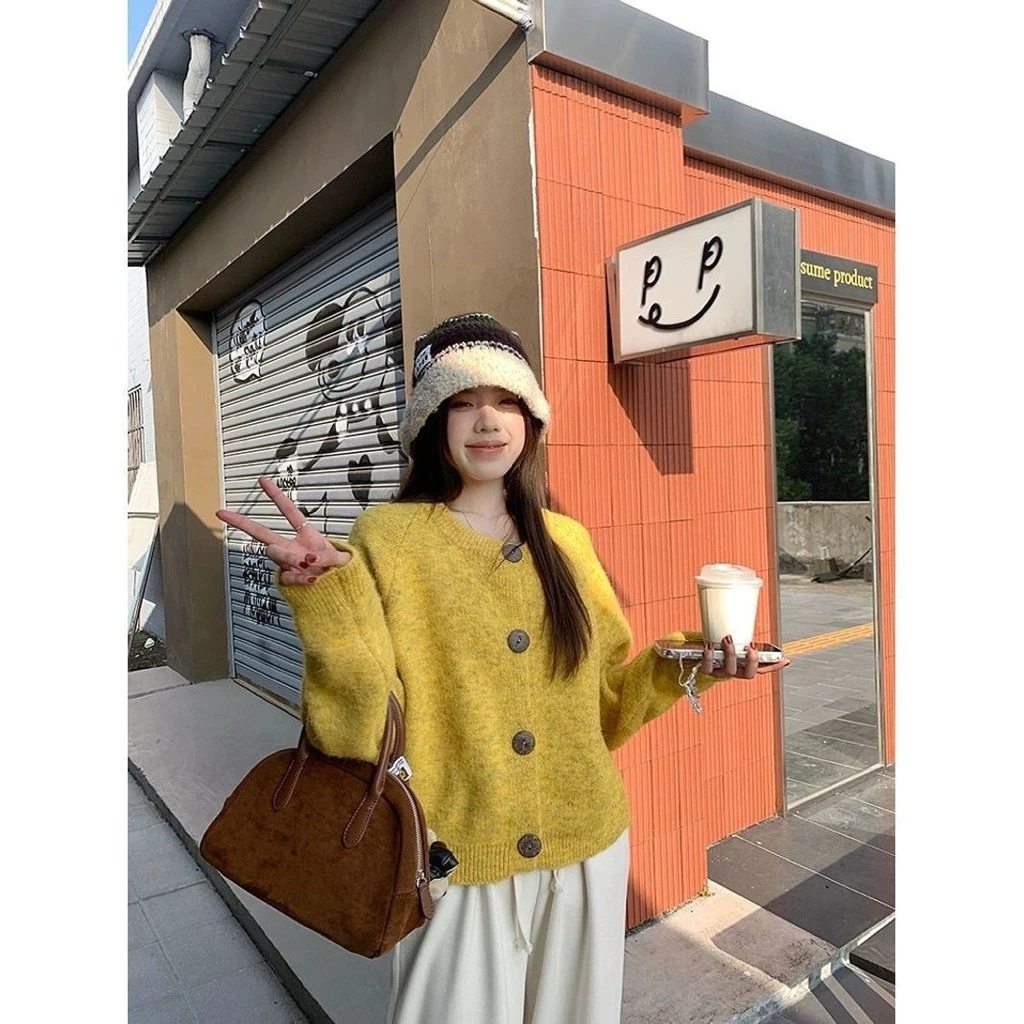 Áo Len Cardigan Nữ Form Rộng Màu Vàng Chanh Dáng Suông Dài Tay Cổ Tròn Khuy Nút Gỗ Nâu Thời Trang Hàn Quốc Nút Gỗ