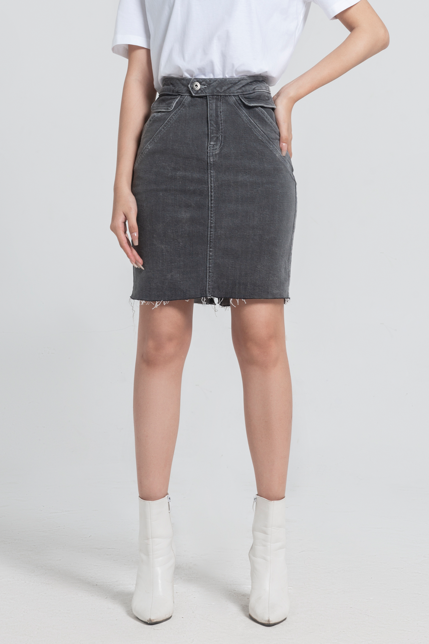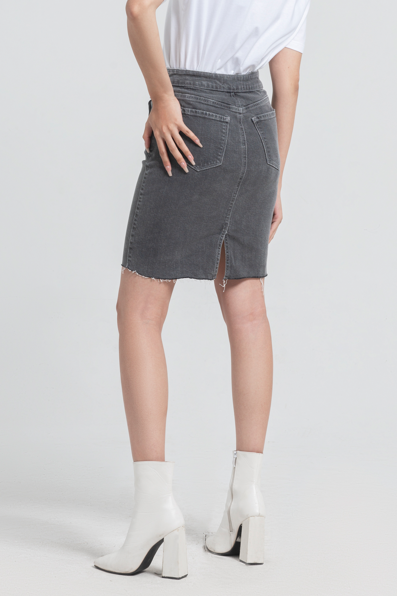 Chân Váy Denim Dáng Bút Chì Cách Điệu Màu Xám. Grey Denim Pencil Skirt