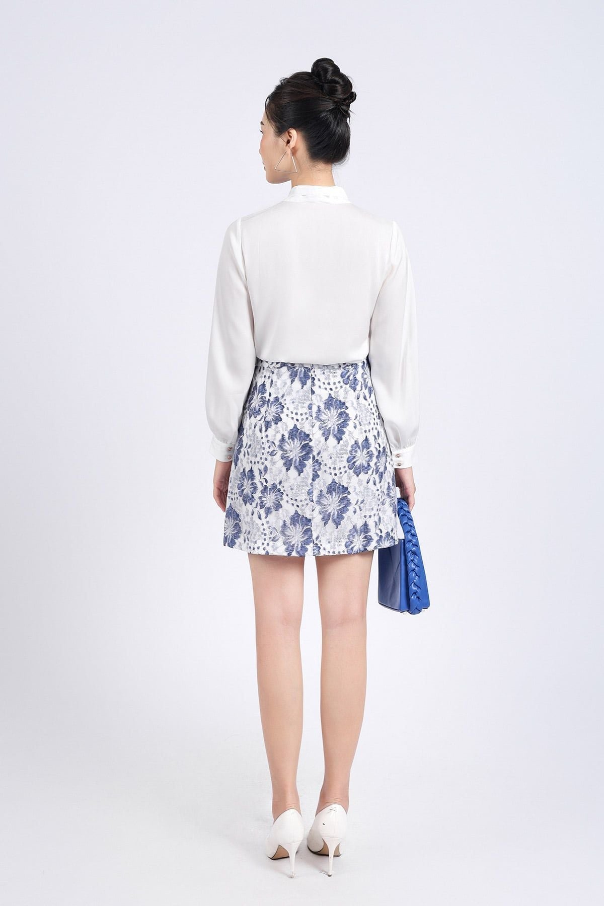 Chân váy ngắn vải lụa tằm phối ren hoa khoá thân sau