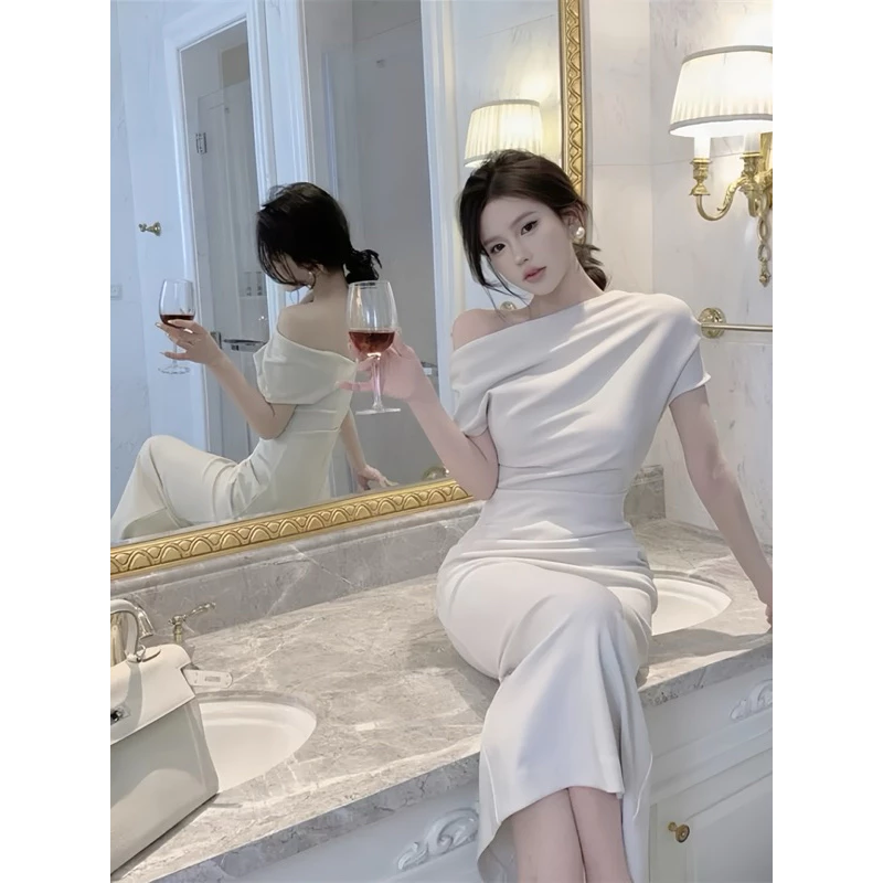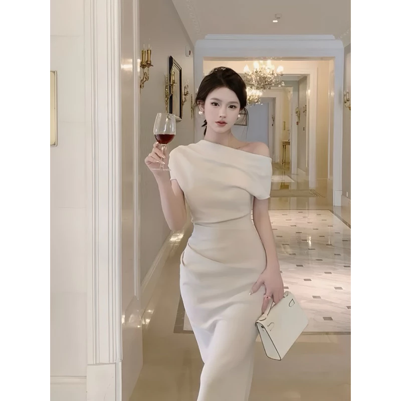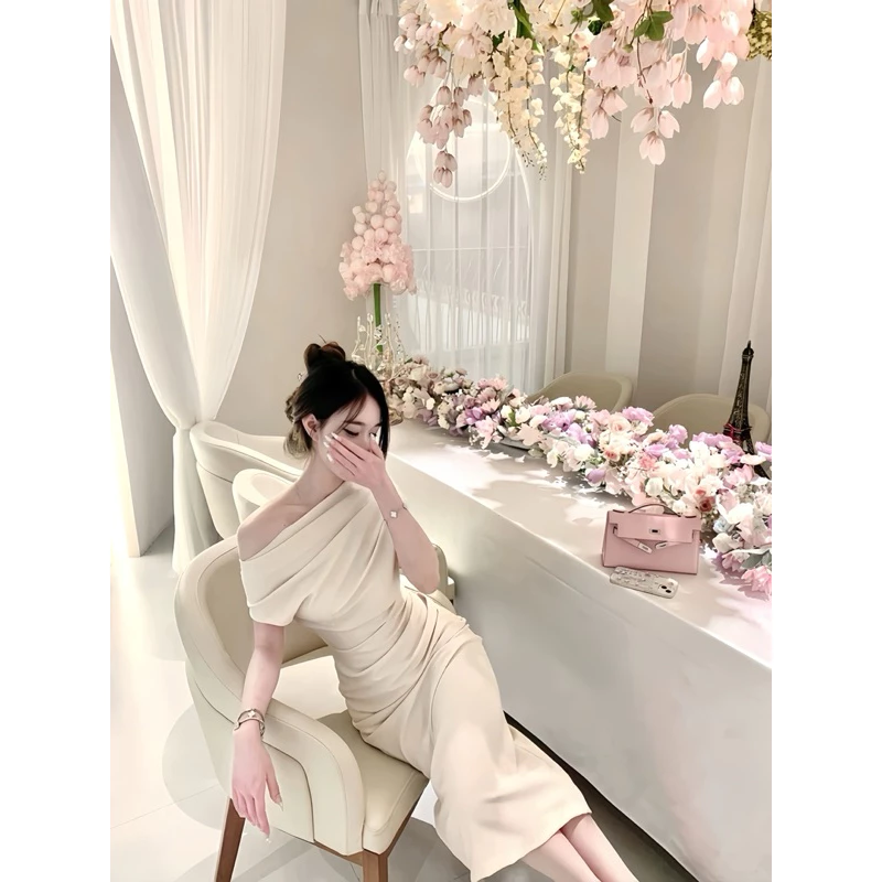 Đầm Body Lệch Vai Dáng Dài Màu Kem – Váy Dự Tiệc Sang Chảnh Logastore_L195
