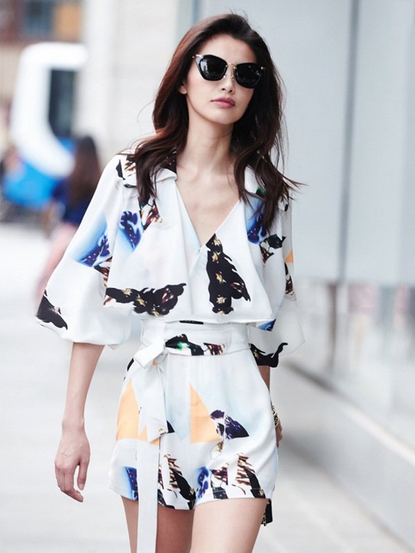 Jumpsuit họa tiết dáng ngắn thiết kế cách điệu kèm dây đai thời trang
